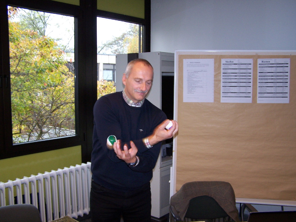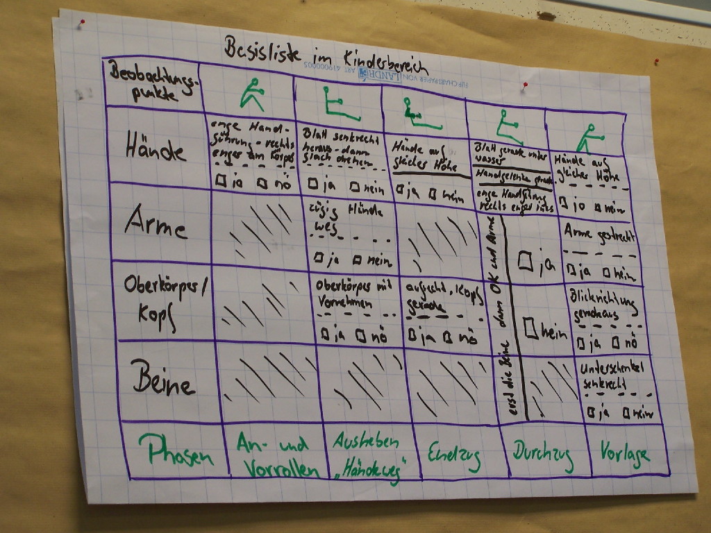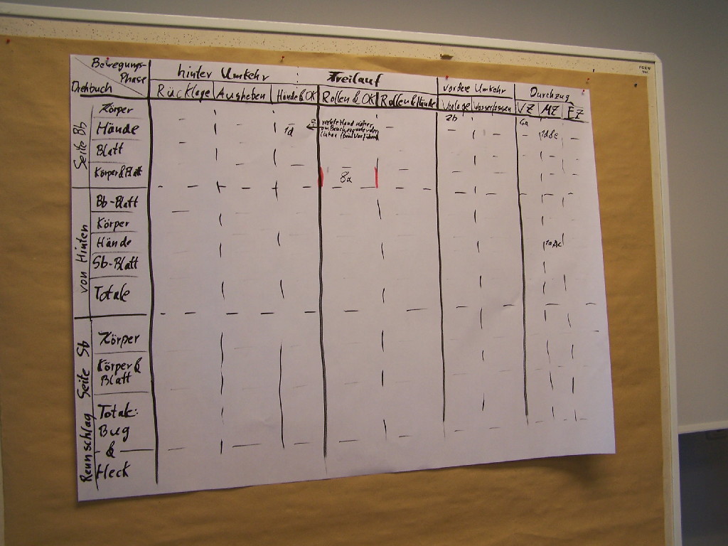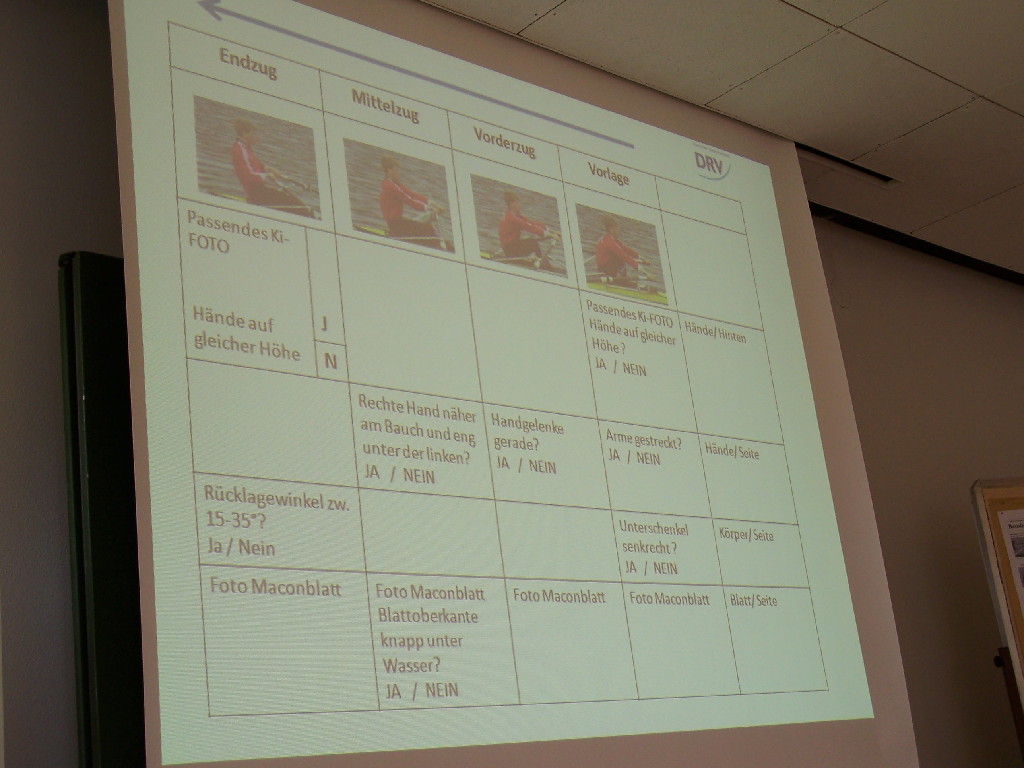 Die zweite Lehrgangshälfte war der Bewegungsbeobachtung und -analyse in Theorie und Praxis (per Videoaufnahme) gewidmet: Zunächst wurde wissenschaftlich erläutert, dass bei wiederholten Reizen eine Gewöhnung eintritt (Mattes) und dann aus der Praxis gezeigt, dass mit variablen Trainingsmethoden, eingeschleifte Bewegungsmuster aufgebrochen werden können (Grahn). Andreas König machte dies mit seinen immer wieder eingestreuten Auflockerungsspielchen sogar für die Kursteilnehmer erlebbar! Einen echten Praxisbezug, und damit der praktische Nutzen, den ich aus dem Lehrgang mit in den Verein nehme, hatten die verschieden vorgestellten Analyse-Bogen. Mit diesen Checklisten wird die auf Video aufgenommene Bewegung eines Ruderers systematisch analysiert, so dass daraus Trainingsschwerpunkte (genannt Zieltechnik) gesetzt werden können. Da die Bogen für unterschiedliche Lernstufen angelegt sind, können sie sowohl für Anfänger, als auch für Experten eingesetzt werden.